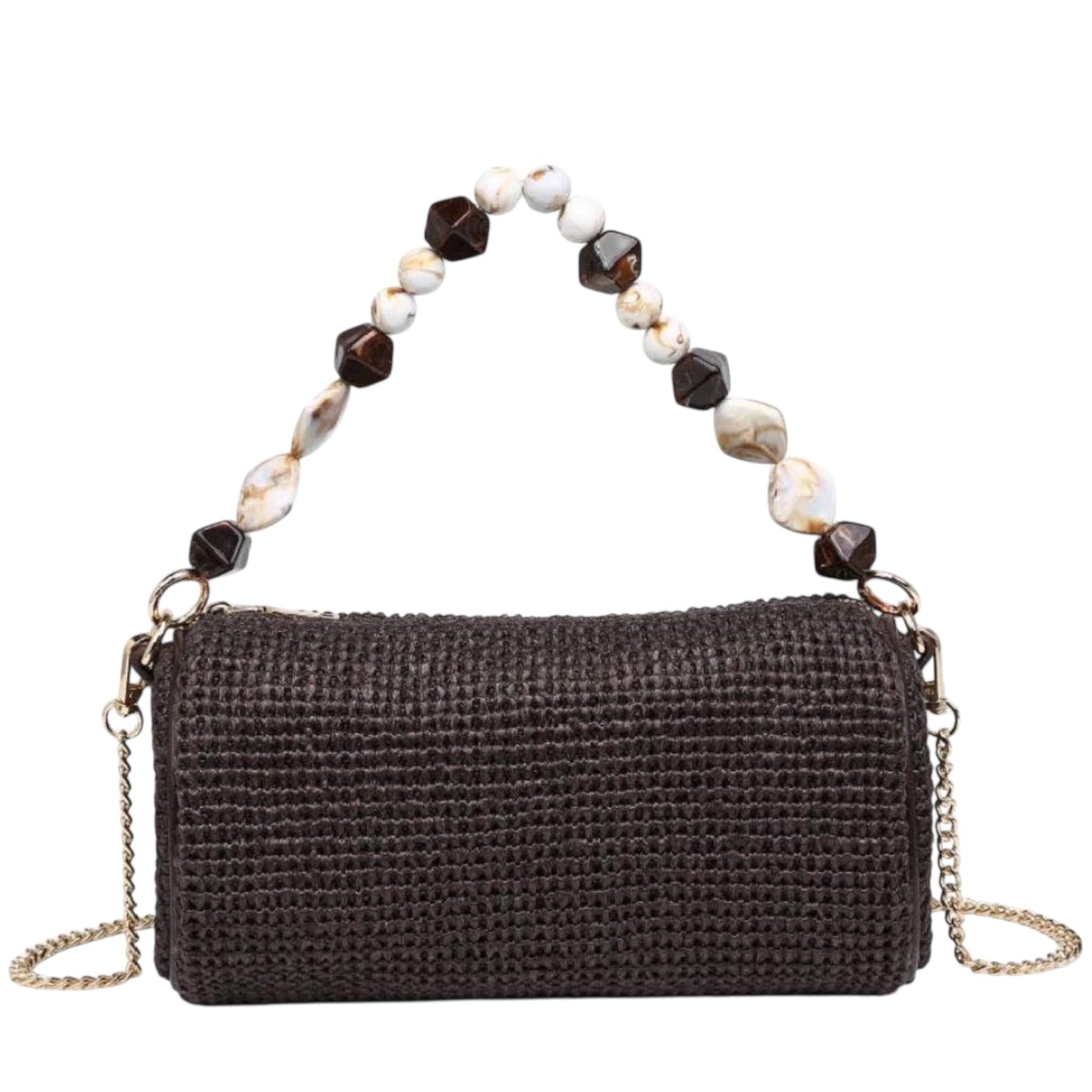 Sculptural barrel silhouette with a beaded statement handle. Compact zip-top clutch, detachable chain converts to crossbody, textured woven exterior, faceted beads add sculptural detail, polished hardware. Fits phone, cards and a few essentials. A versatile evening-to-day piece for women who follow trends yet value thoughtful, wearable design. *Item Type: Clutch