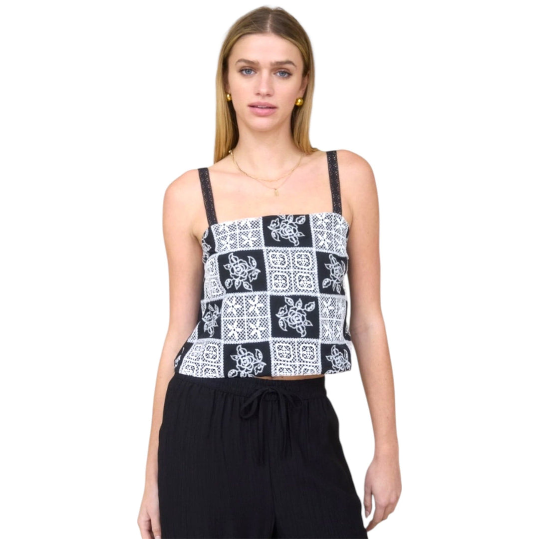 Black and White Embroidery Checkered Pattern Lace Spaghetti Top