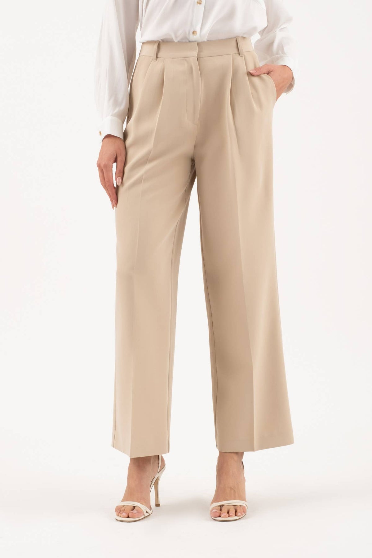 HIGH WAIST BUTTON & ZIPPER CLOSURE BAR & HOOK CLOSURE BELT LOOPS BACK ELASTIC TUNNEL POCKETS FRONT PLEAT DETAIL SOLID NOT LINED DRESS PANTS 100% POLYESTER