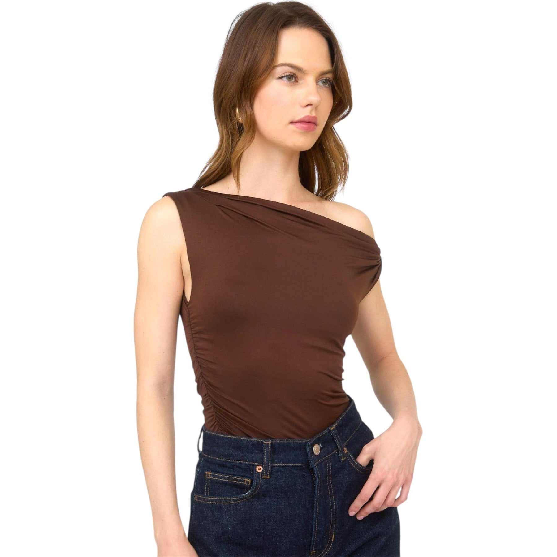 OFF THE SHOULDER SLEEVELESS TWIST SHOULDER DETAIL RUCHED SIDE DETAIL SOLID NOT LINED KNIT TOP 95%POLYESTER 5%SPANDEX
