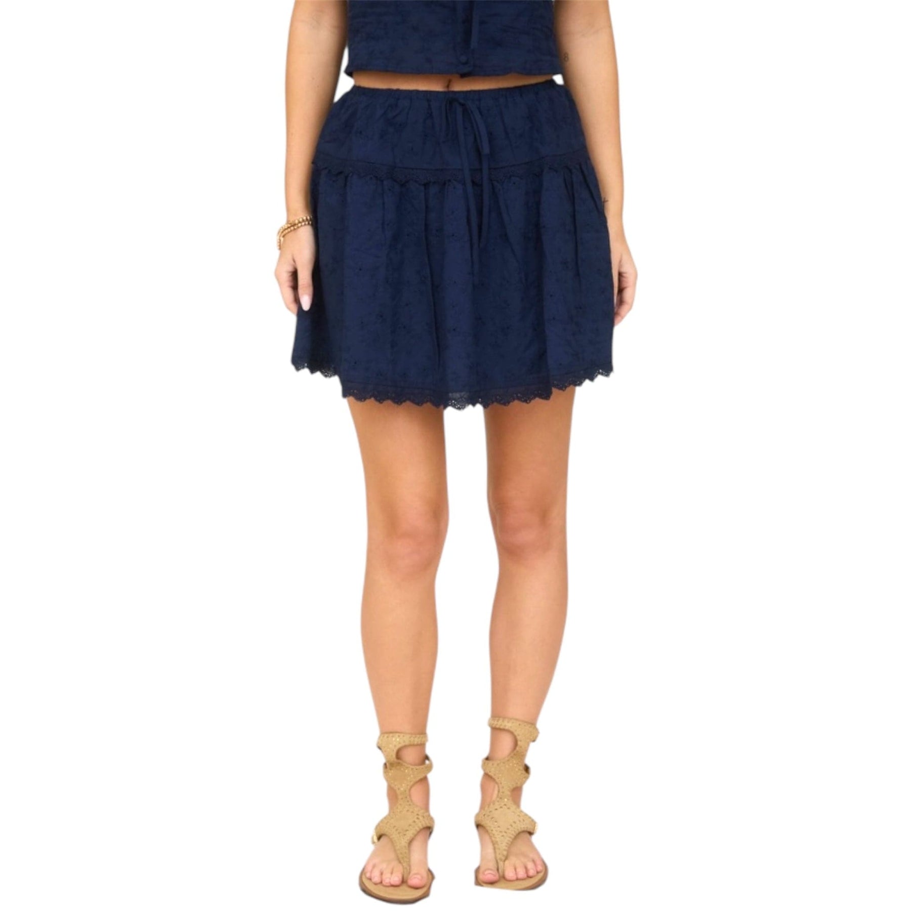 High waist Elastic waist Hip band detail Lace trim detail Eyelet pattern Mini skirt Lined Self:100%cotton Contrast:100%cotton Lining:100%lining