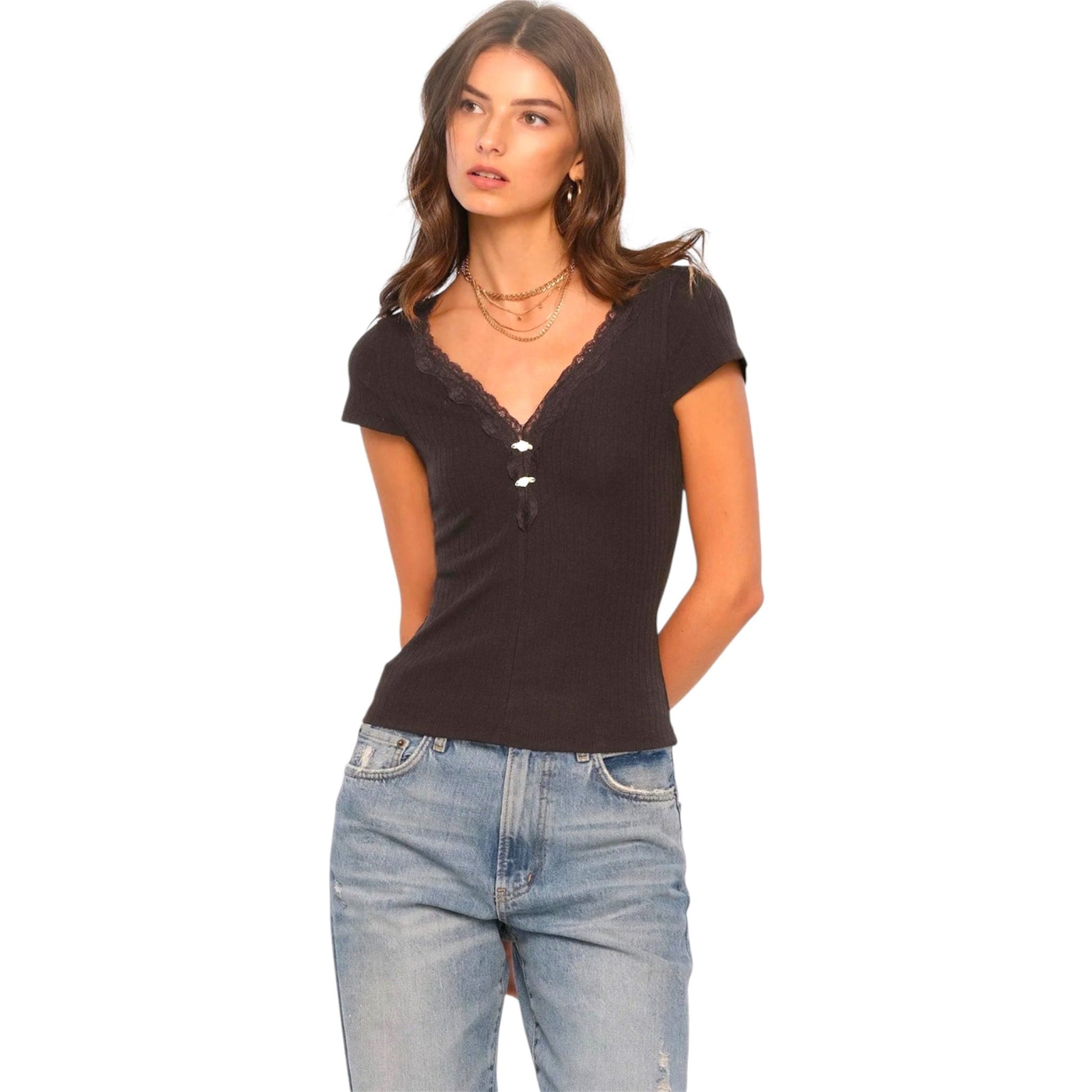 A pretty tee with a twist, The Aranelle Top. Made from a soft ribbed knit, it features lace trim, a delicate v-neck, and rosette details. Dress it up with a pair of wide-leg trousers or dress it down with denim.