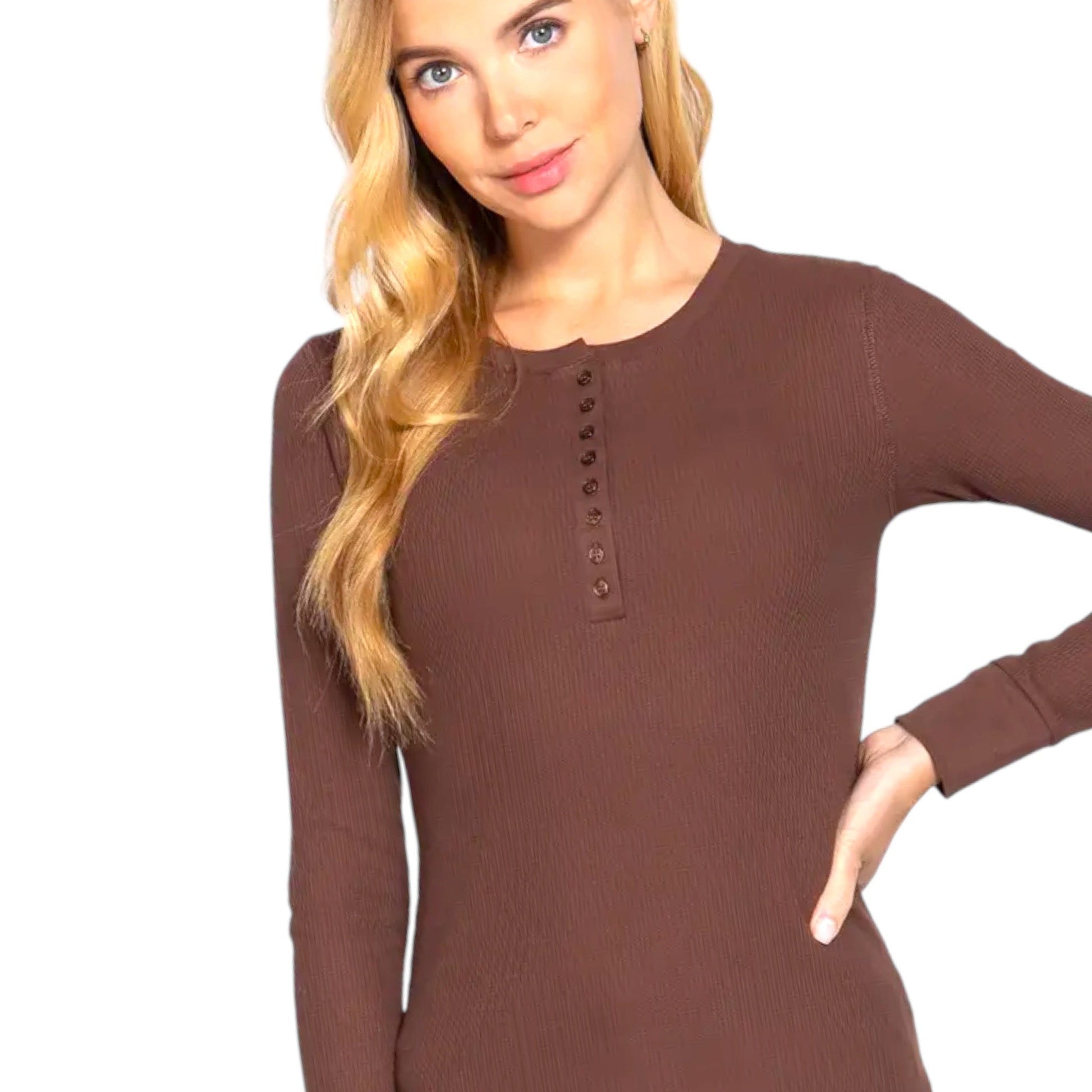 LONG SLEEVE HENLEY THERMAL KNIT TOP FABRIC: THERMAL 58% COTTON 39% POLYESTER 3% SPANDEX