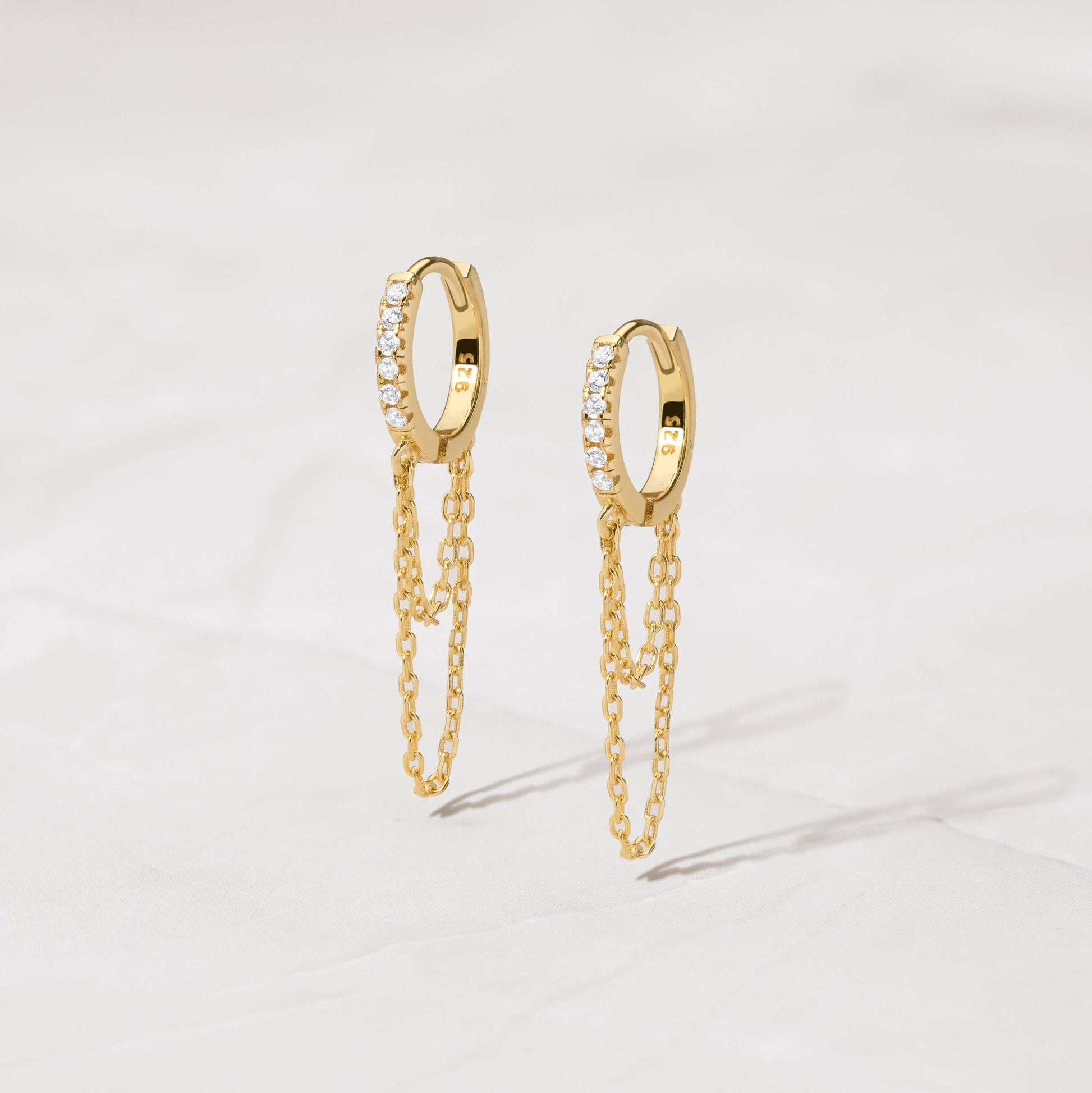 Super cute & on-trend huggie style earrings featuring a double loop chain design. Looks great stacked or on its own!
