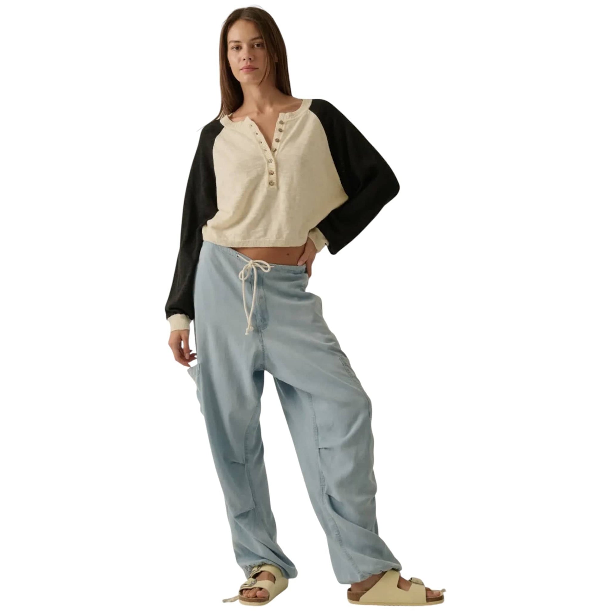 A color block slub-knit sweater with the following features: Round neckline. Half-button henley closure. Long raglan sleeves. Rib-knit collar, cuffs, and hem. Loose fit.