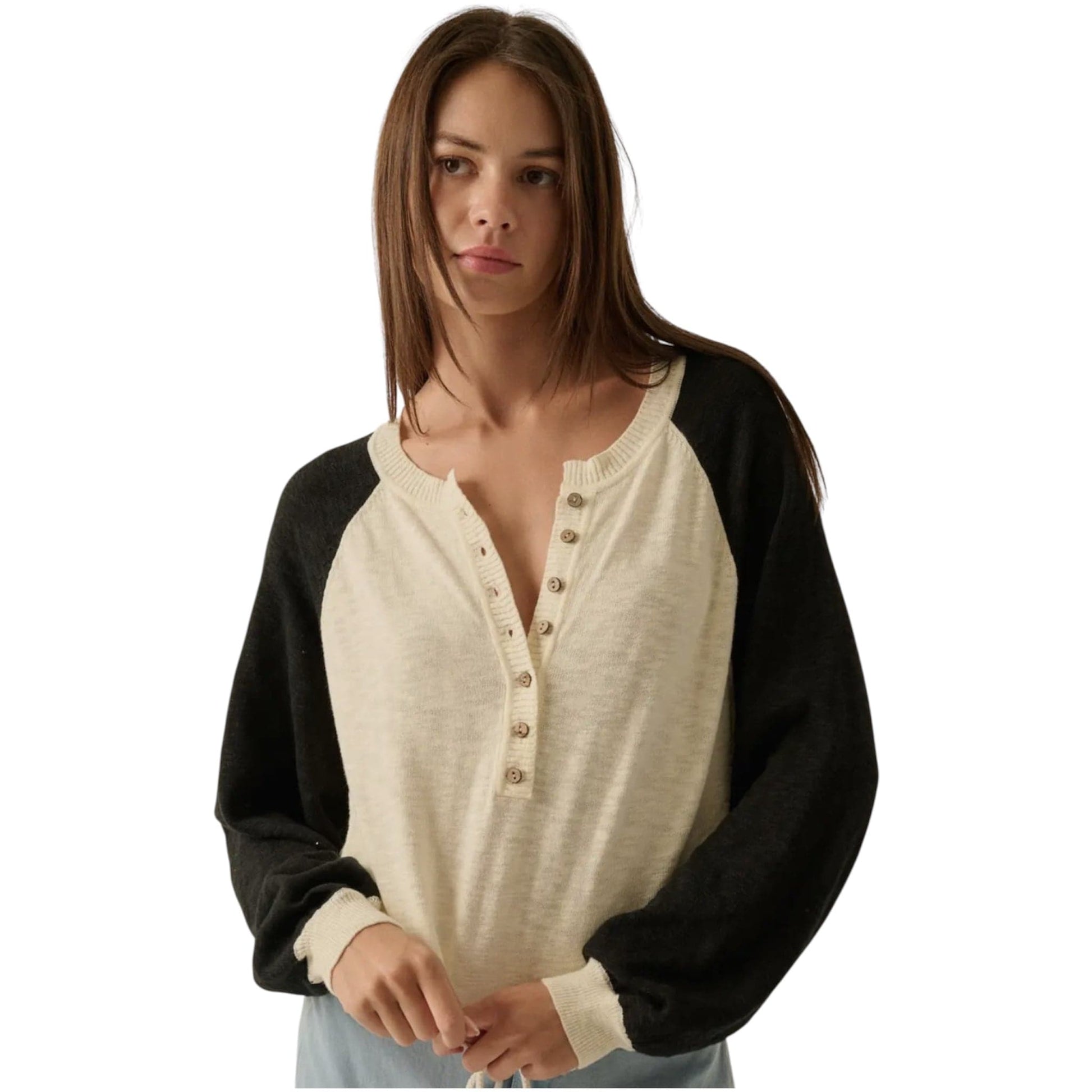 Color Block Slub Knit Henley Raglan Sleeve Sweater