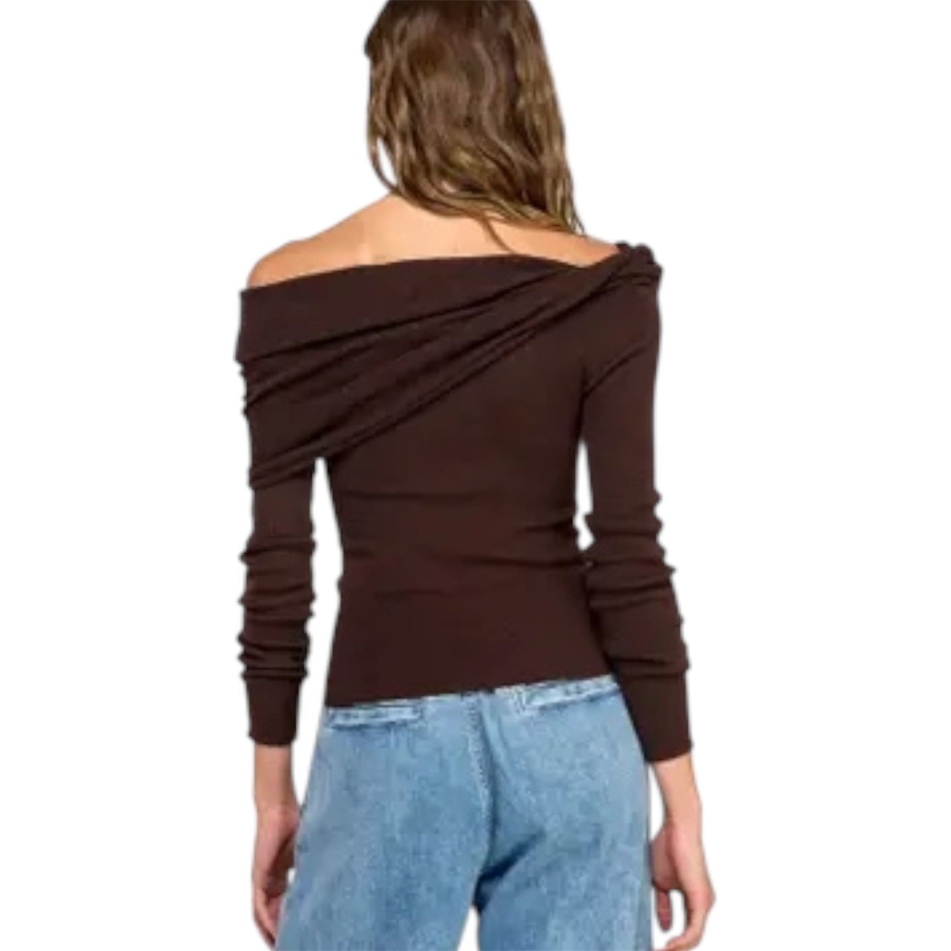 This crossover off shoulder sweater brings a modern twist to a classic silhouette. Designed in a soft stretch knit, it hugs the body with a flattering fit and elegant neckline. Perfect for effortless styling from day to night. -50%POLY 20%ACRYLIC 20% NYLON 6% WOOL