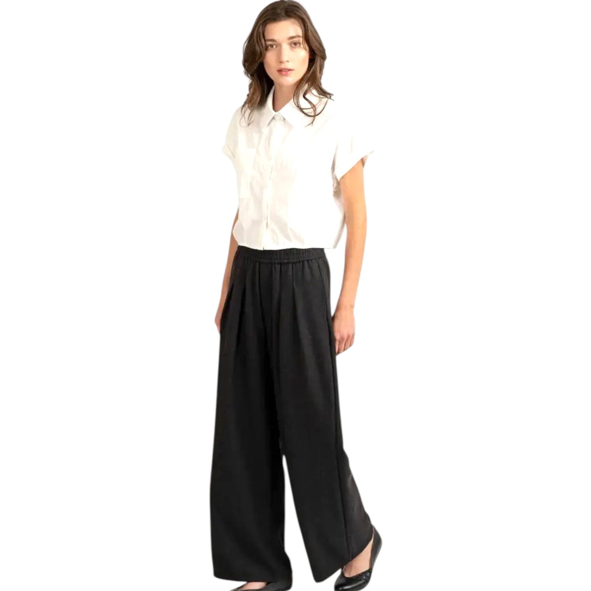 Full length with flowy wide leg silhouette - Elastic waistband for a comfortable, pull-on fit - Front pleats add volume and tailored detail - Lightweight drape for everyday ease - Perfect for both casual wear and polished looks