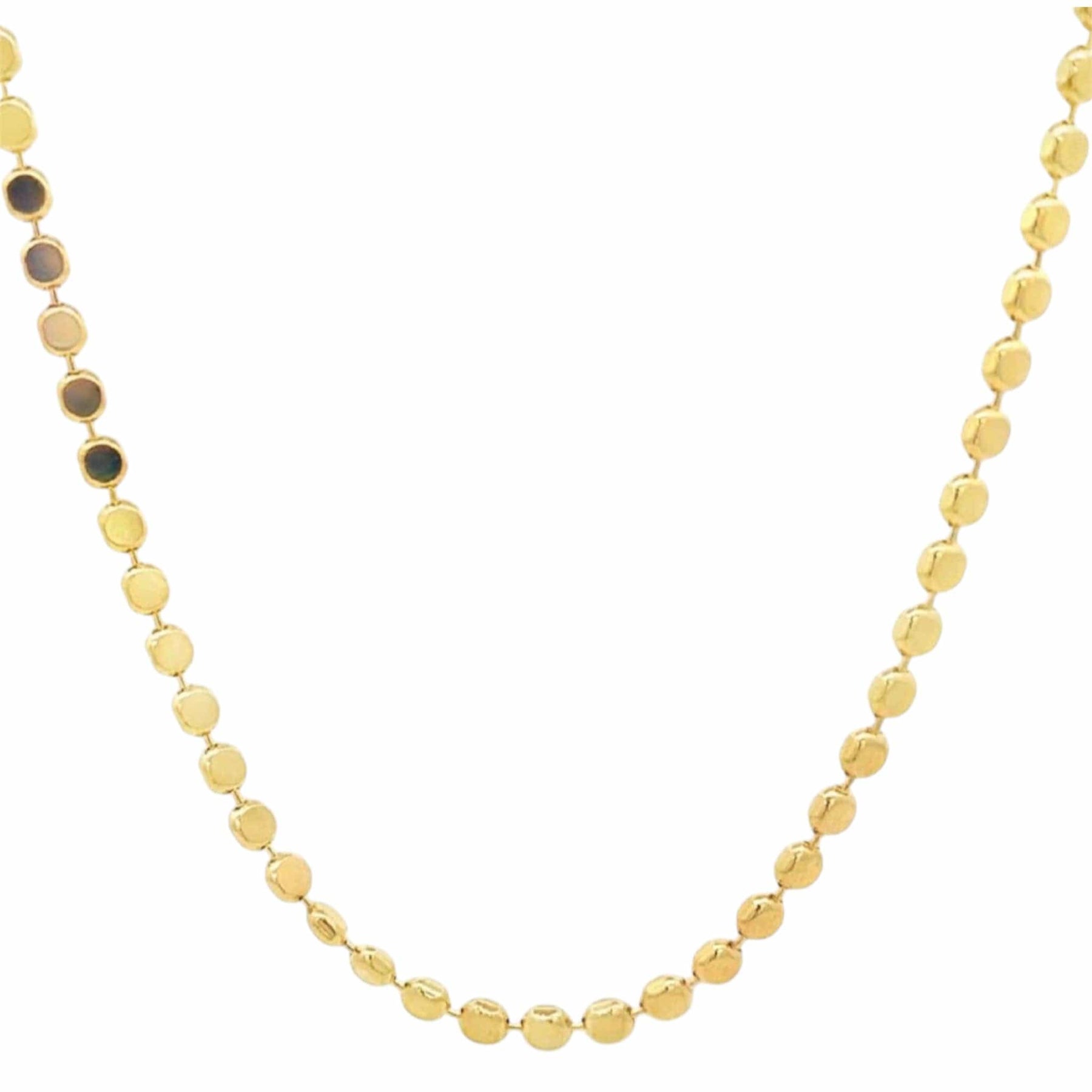 This exquisite Flat Ball Disc Chain elevates any outfit with its sleek design and flawless craftsmanship. The flat ball discs effortlessly glide along the delicate chain, creating a luxurious and sophisticated look. Indulge in the art of accessorizing and adorn yourself with this premium piece. Description: * Material: 18K Gold Filled * Length: 14&16 * Thickness: 3mm * Height: 1.6mm
