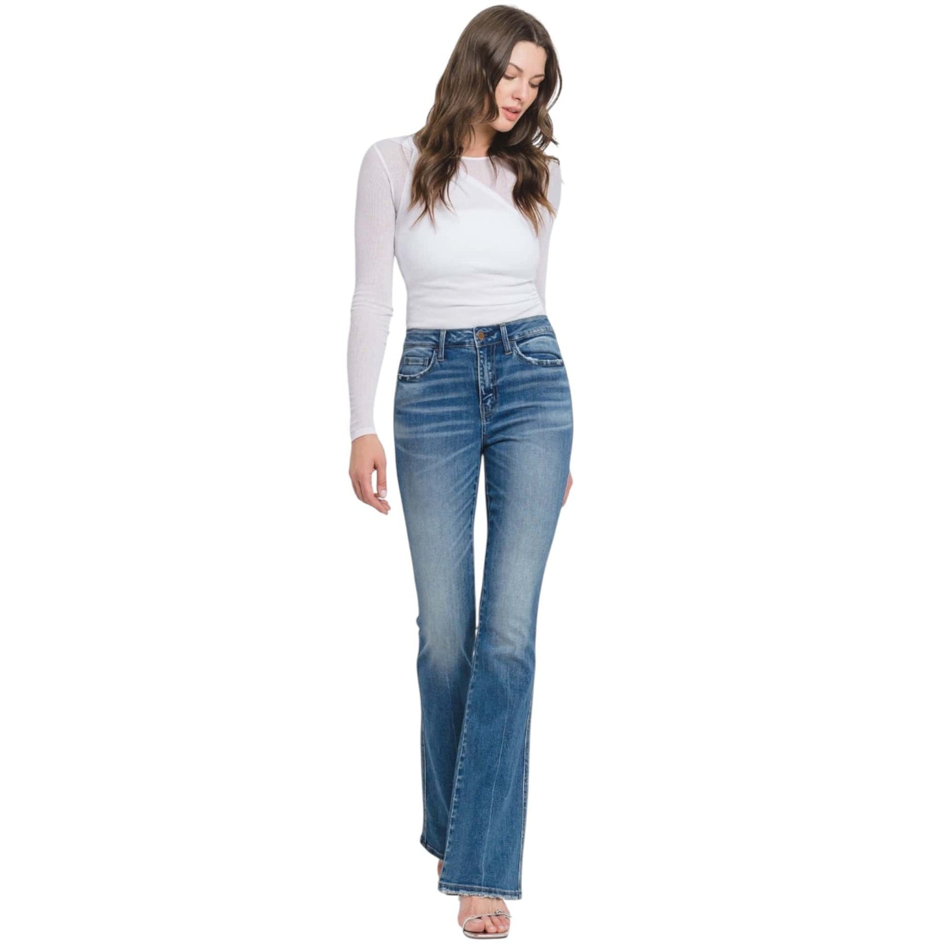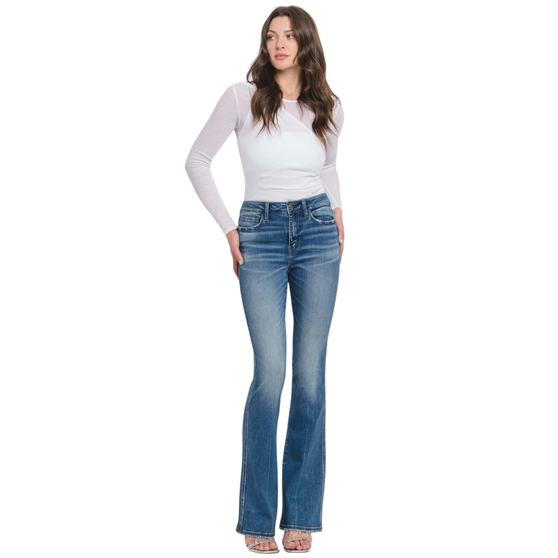 HIGH RISE FULL LENGTH BOOTCUT JEANS COMFORT STRETCH DENIM, HIGH RISE WAIST, FINISHED HEM, FULL LENGTH, BOOTCUT JEANS F. RISE: 10" / INSEAM: 33" /