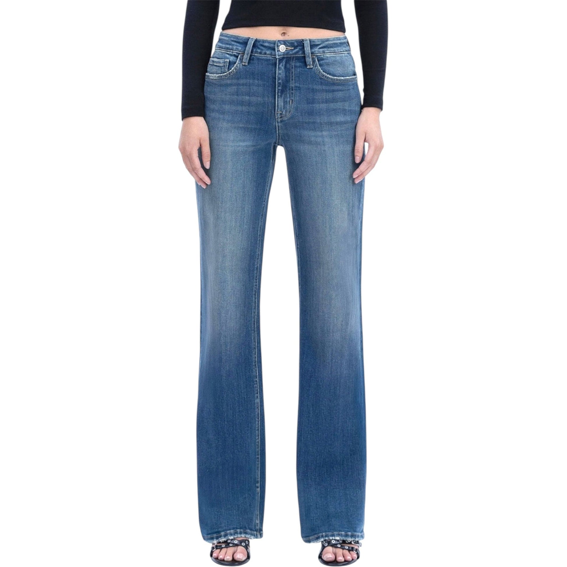 MID RISE FULL LENGTH VINTAGE FLARE JEANS COMFORT STRETCH DENIM, MID RISE WAIST, FINISHED HEM, FULL LENGTH, VINTAGE FLARE JEANS F. RISE: 10" / INSEAM: 33" / LEG OPENING