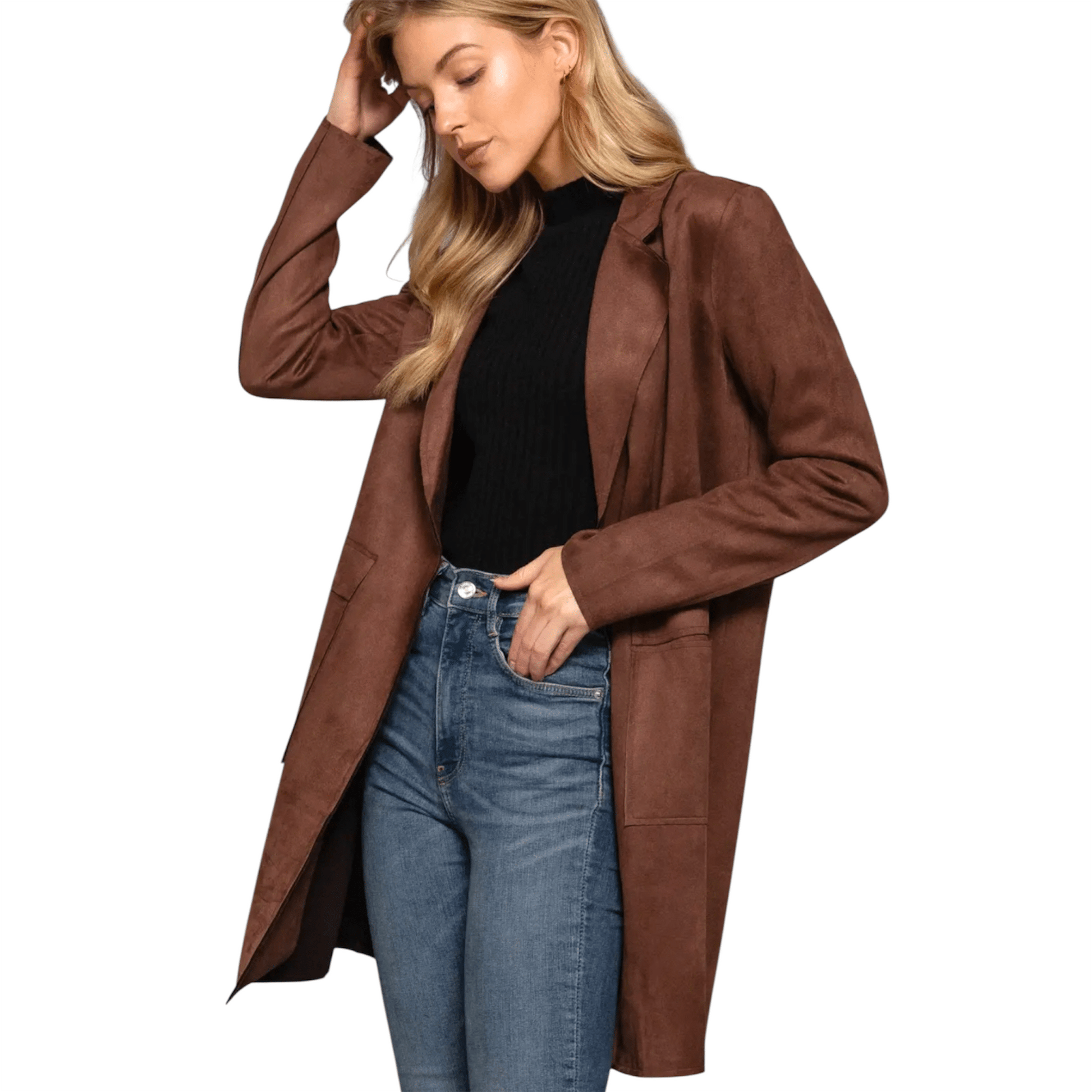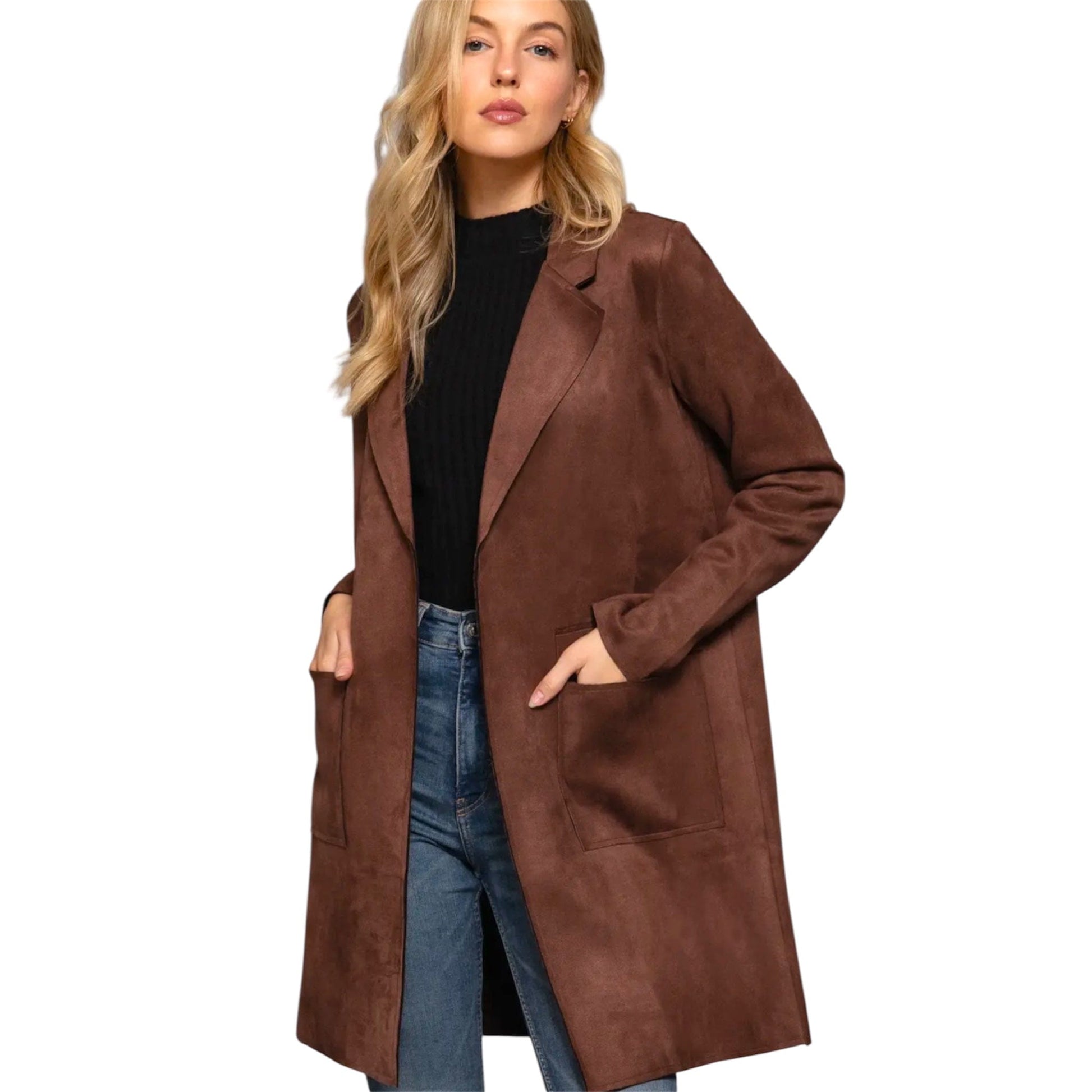 Long Sleeve Open Front Faux Suede Jacket in Dark Brown