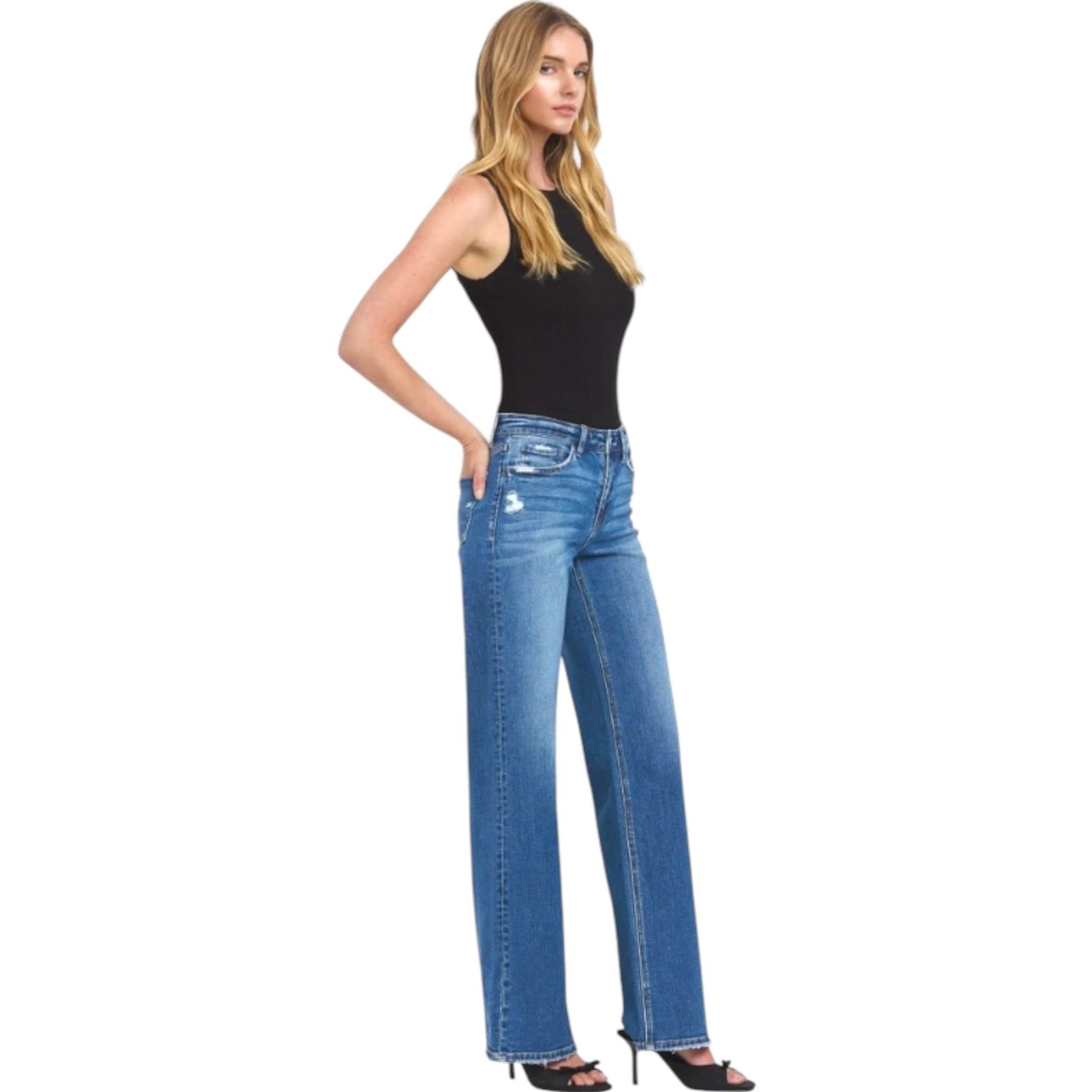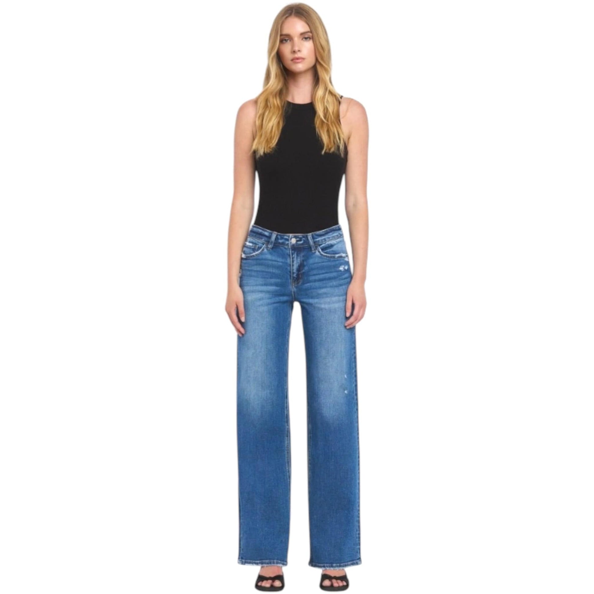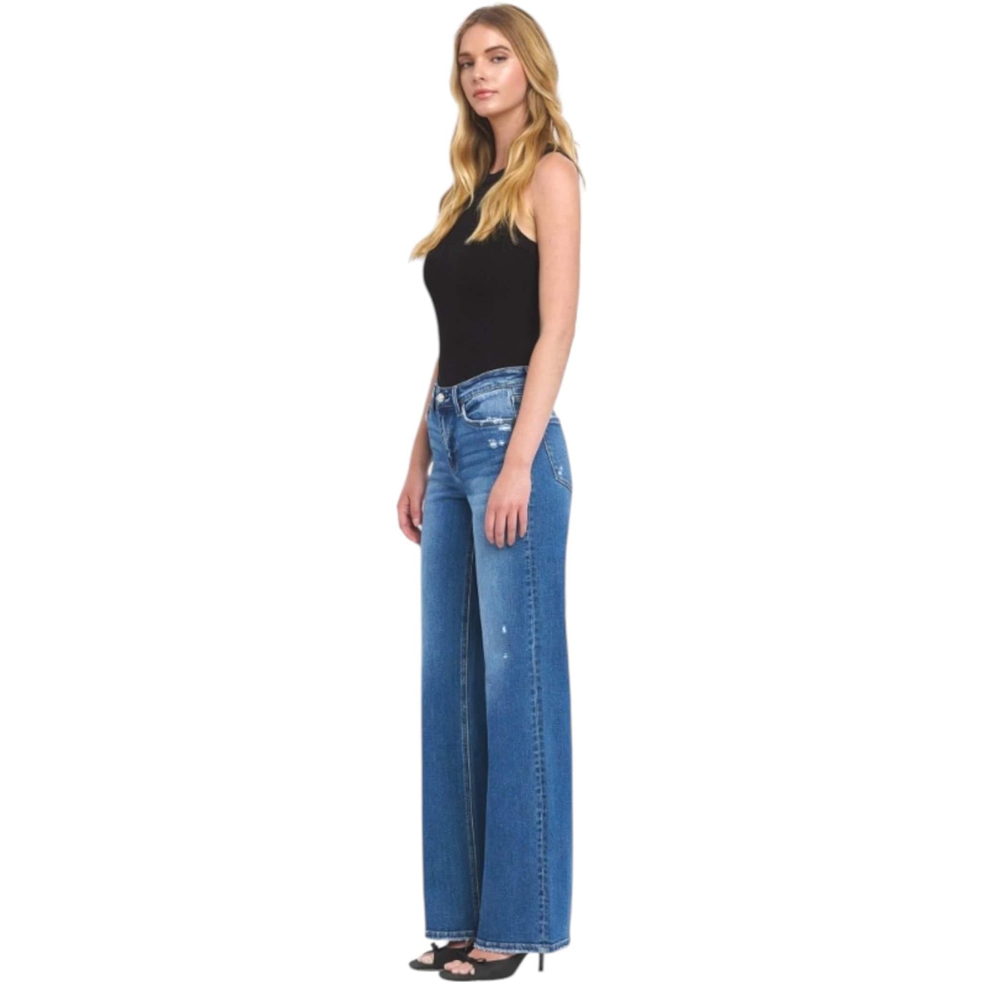 MID RISE FULL LENGTH WIDE LEG JEANS COMFORT STRETCH DENIM, MID RISE WAIST, SLIGHTLY DISTRESSED DETAIL, FULL LENGTH, WIDE LEG JEANS F. RISE: 9 1/2" / INSEAM: 34" / LEG OPENING: 21" MODEL IS 5'10" WEARING A SIZE 26