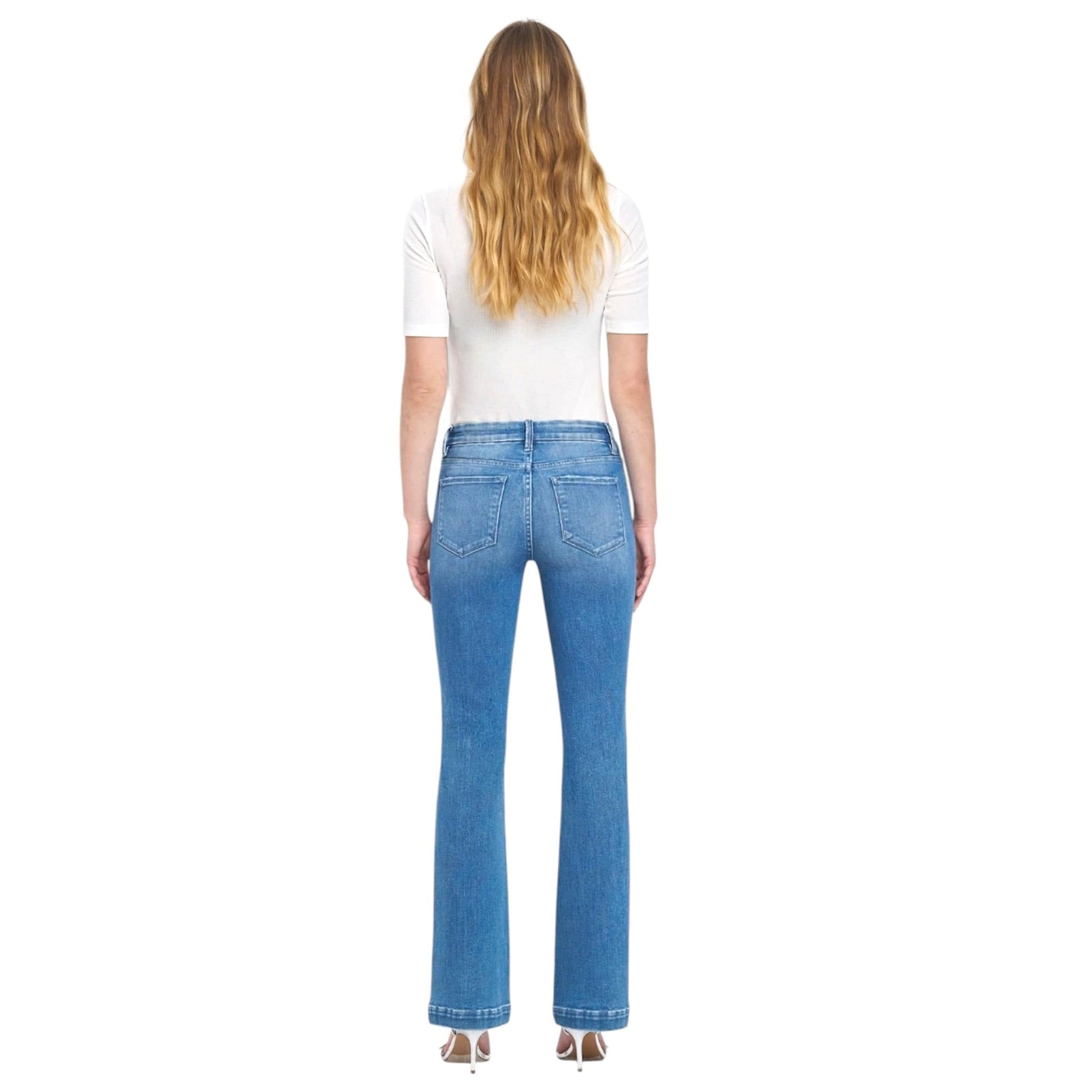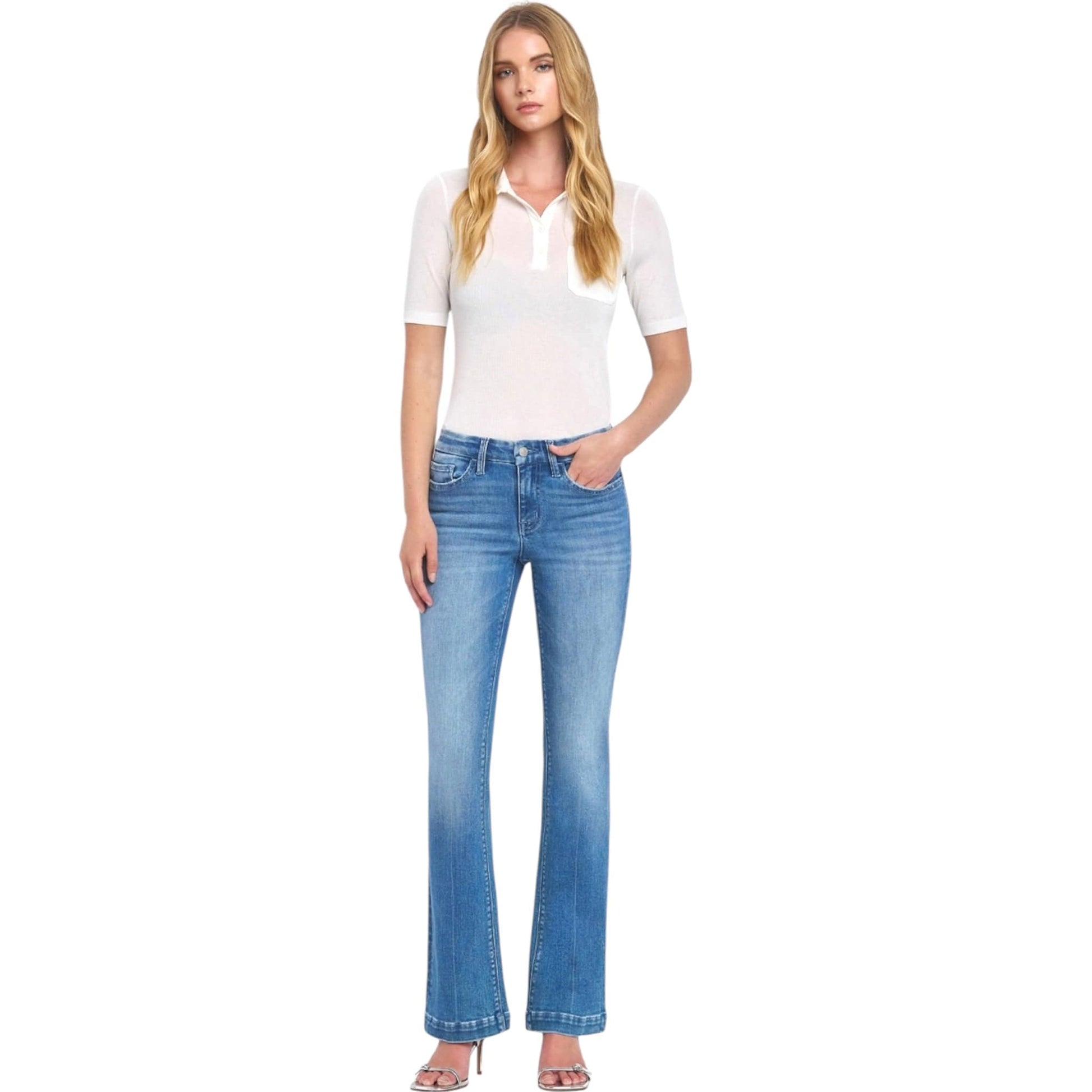 MID RISE SEAMLESS WAISTBAND BOOTCUT JEANS COMFORT STRETCH DENIM, MID RISE WAIST, SEAMLESS WAISTBAND, TROUSER HEM, FULL LENGTH, BOOTCUT JEANS F. RISE: 9" / INSEAM: 32" / LEG OPENING: 18"