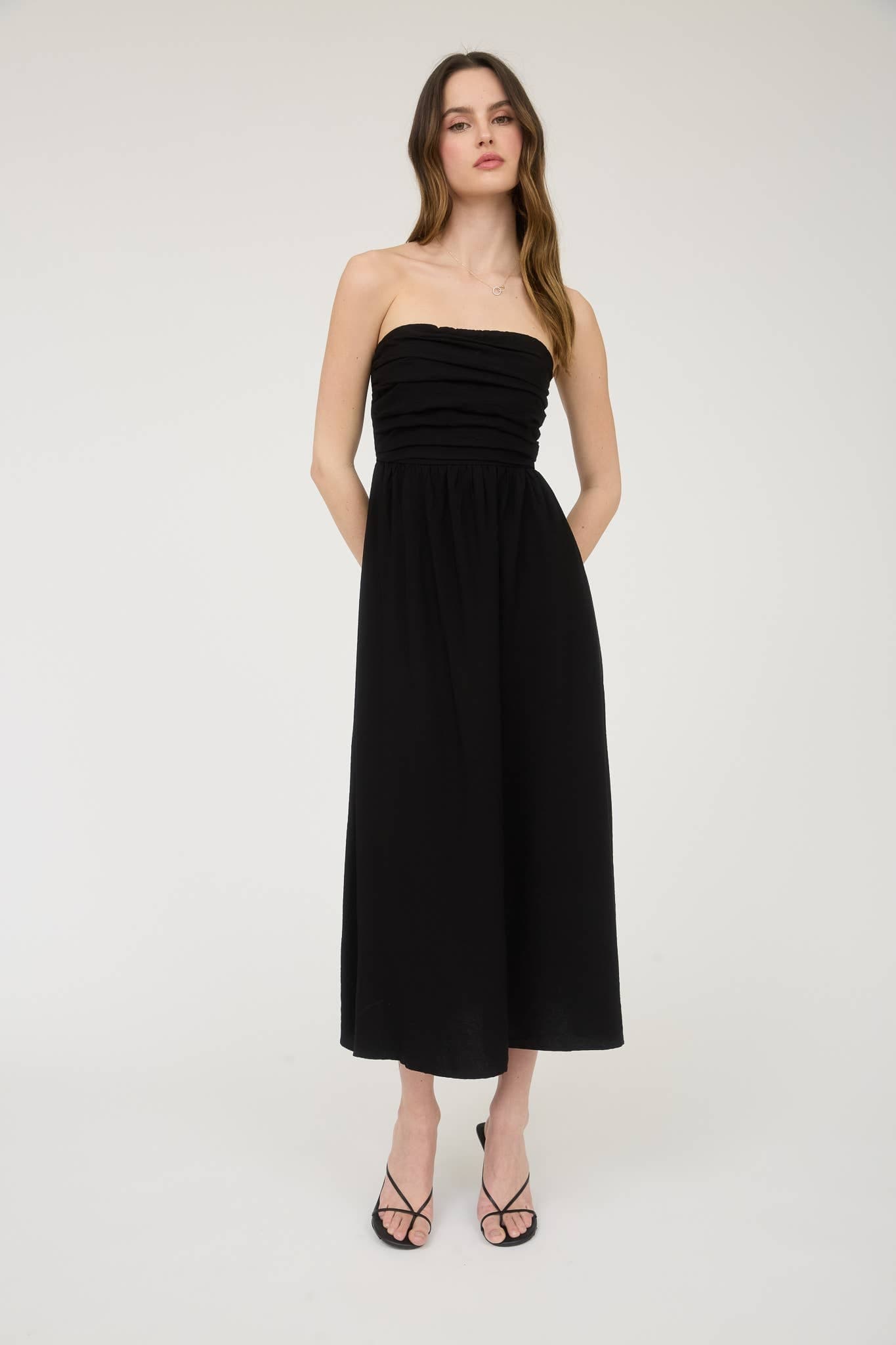 STRAPLESS SLEEVELESS BACK SMOCKING A-LINE MIDI DRESS SUNDRESS SHELL: 80%RAYON 20%NYLON LINING: 100% POLYESTER