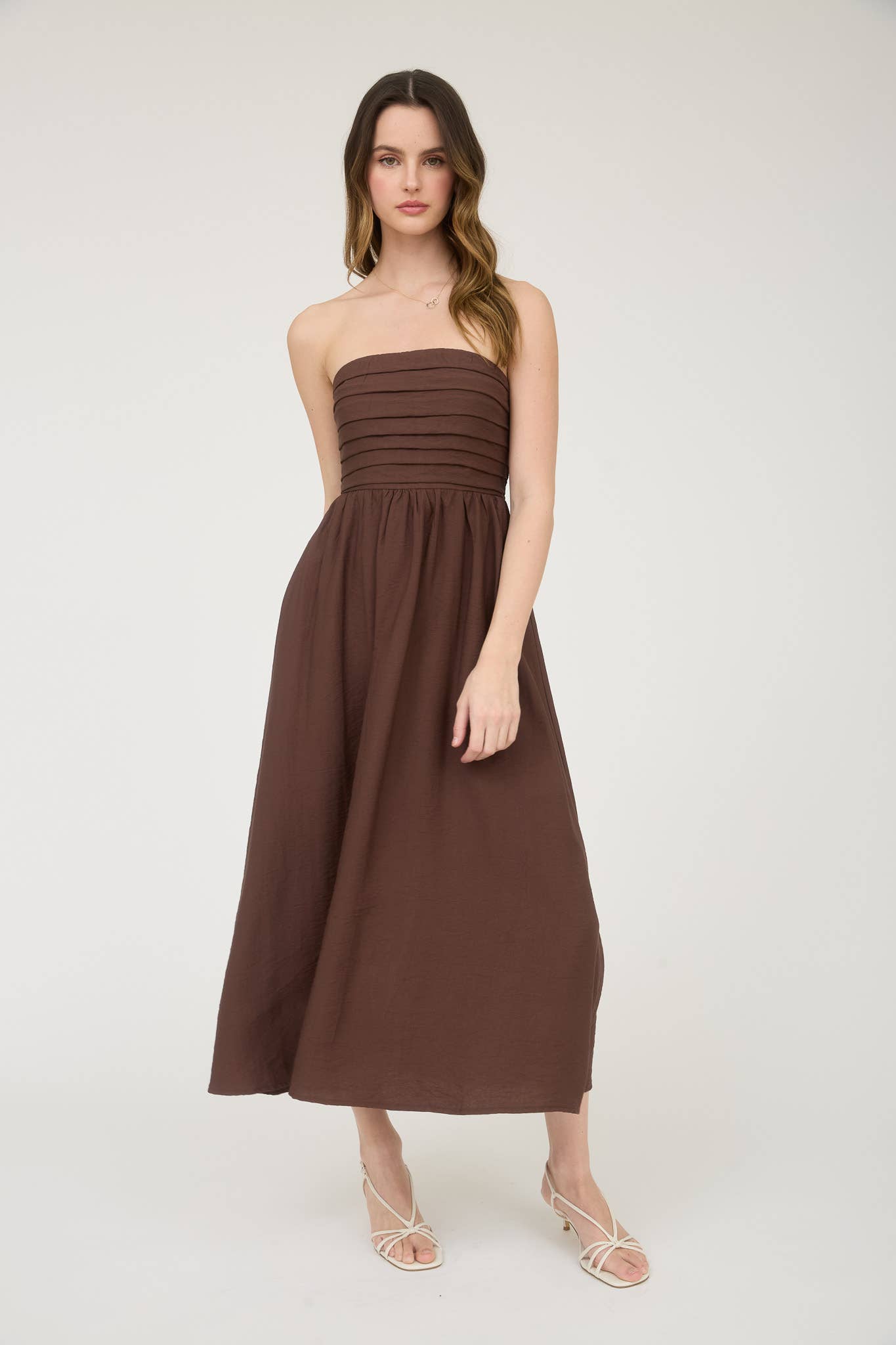 Brown Pleated Bodice Strapless Midi Dress