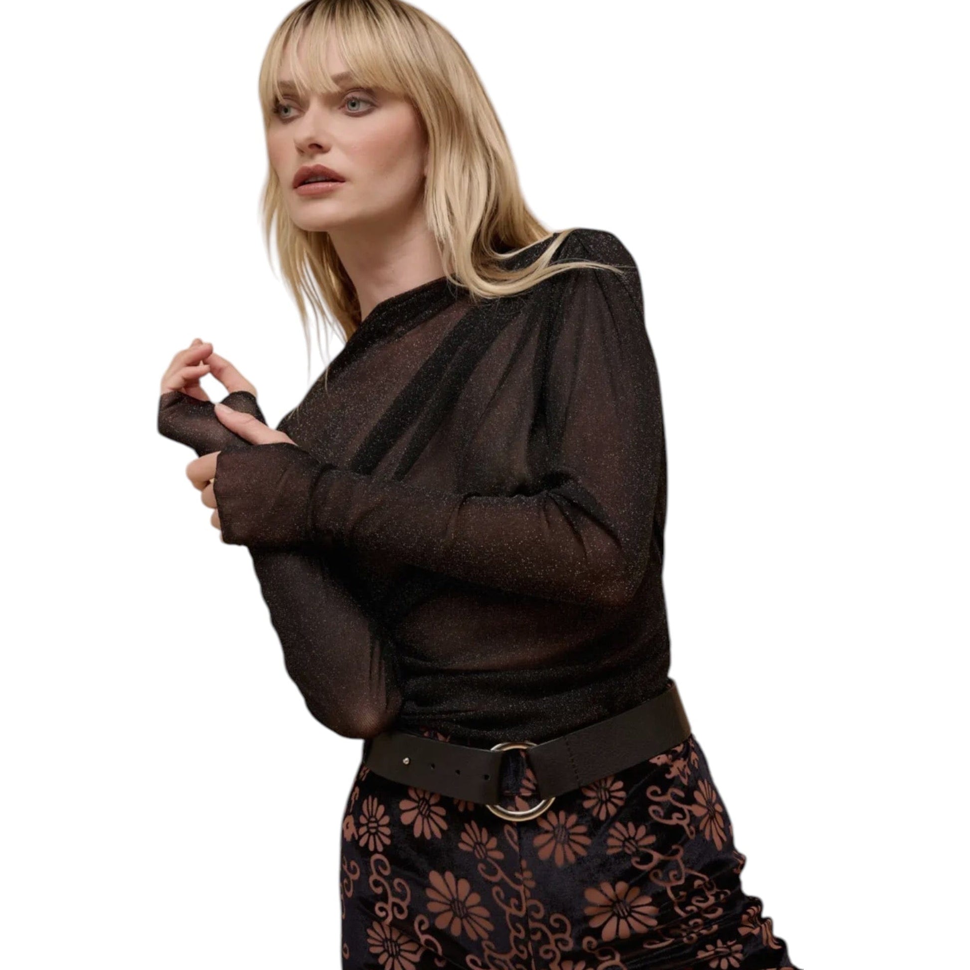 Sheer Metallic Mesh Draped Boatneck Bodysuit