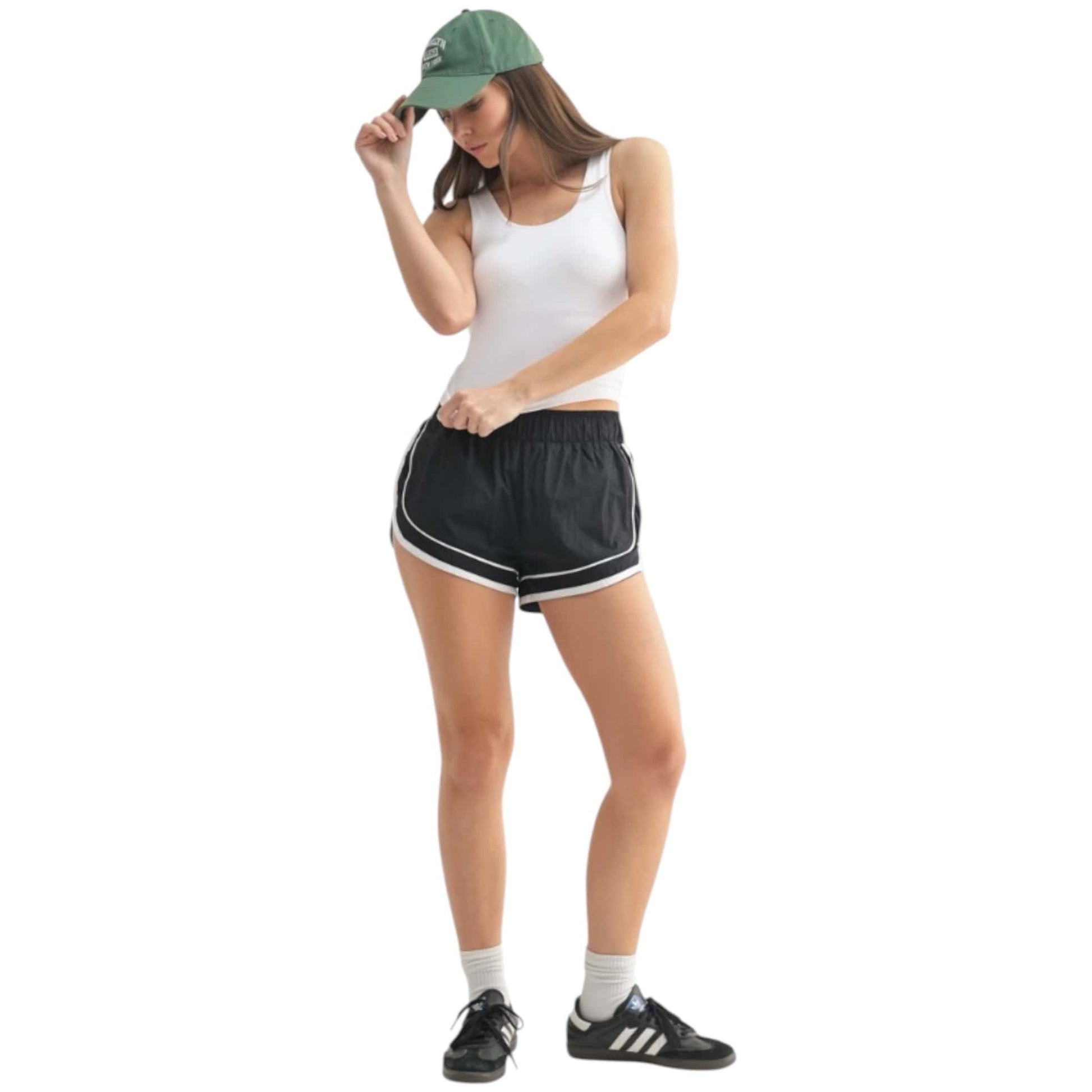 Designed for movement and style. These dolphin active shorts feature a curved hemline for a flattering, sporty silhouette, accented by a bold contrast stripe that adds a pop of energy. The elastic waistband ensures a secure, comfortable fit. Perfectly versatile, these shorts keep you cool and confident from workouts to weekends- 100% nylon