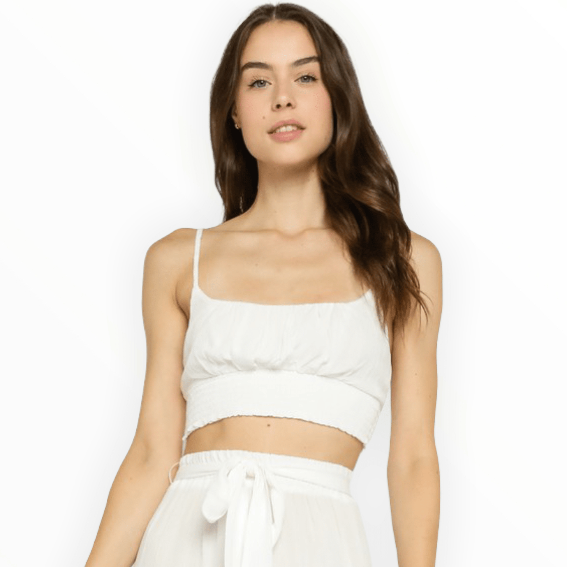 Our Cropped Tank Top features a smocked waist and adjustable straps.